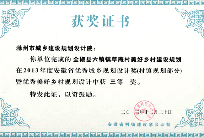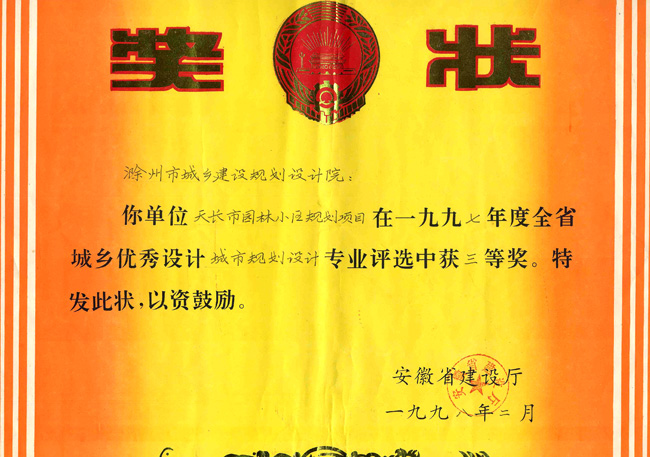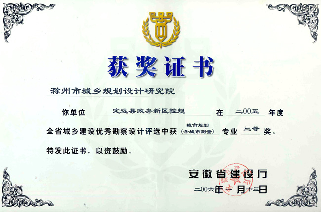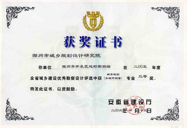 滁州市經(jīng)開區(qū)地形圖測(cè)繪規(guī)劃獲獎(jiǎng)證書