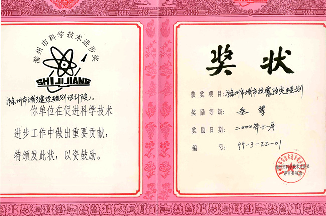 滁州市抗震防災(zāi)規(guī)劃(科技進(jìn)步三等獎(jiǎng)).