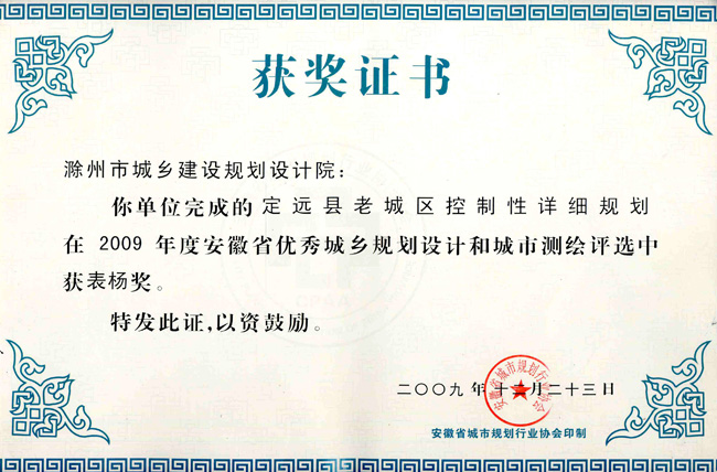 明光市中心城區(qū)規(guī)劃獲獎(jiǎng)證書